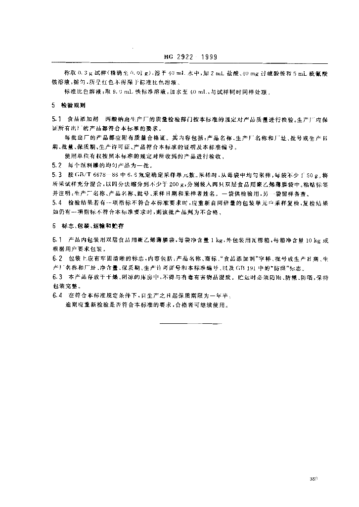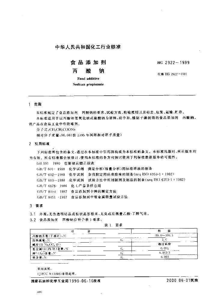 HG 2922-1999 食品添加剂 丙酸钠