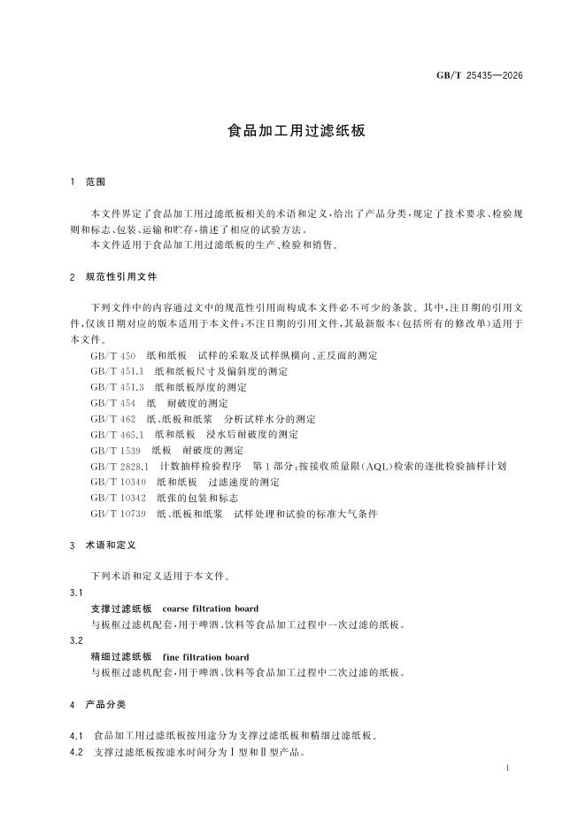 GB/T 25435-2026 食品加工用过滤纸板