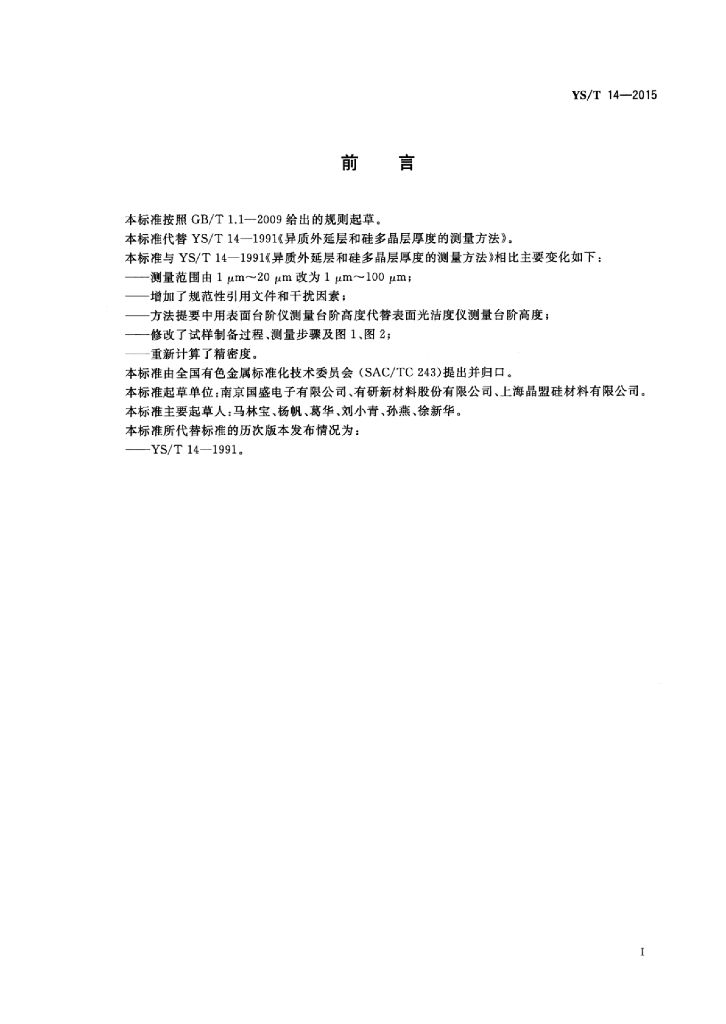 YS/T 14-2015 异质外延层和硅多晶层厚度的测量方法