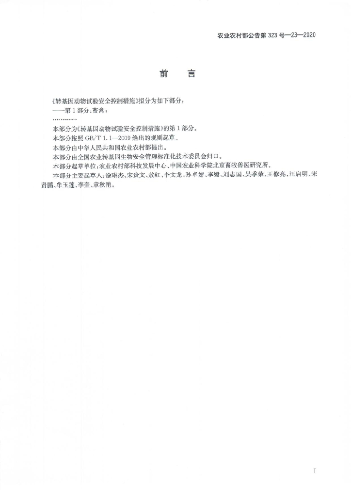 农业农村部公告第323号-23-2020 转基因动物试验安全控制措施 第1部分:畜禽
