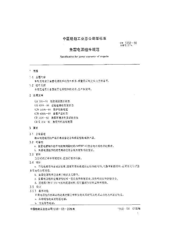 CB 1332-1998 鱼雷电源组件规范