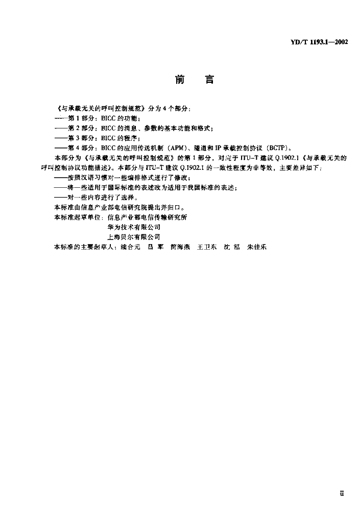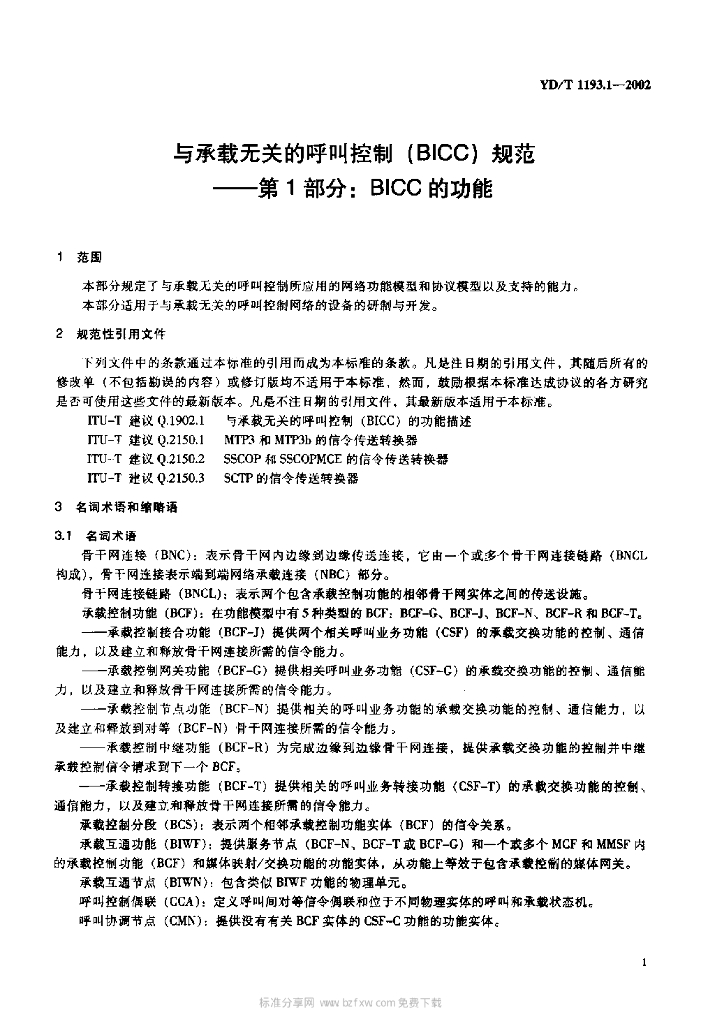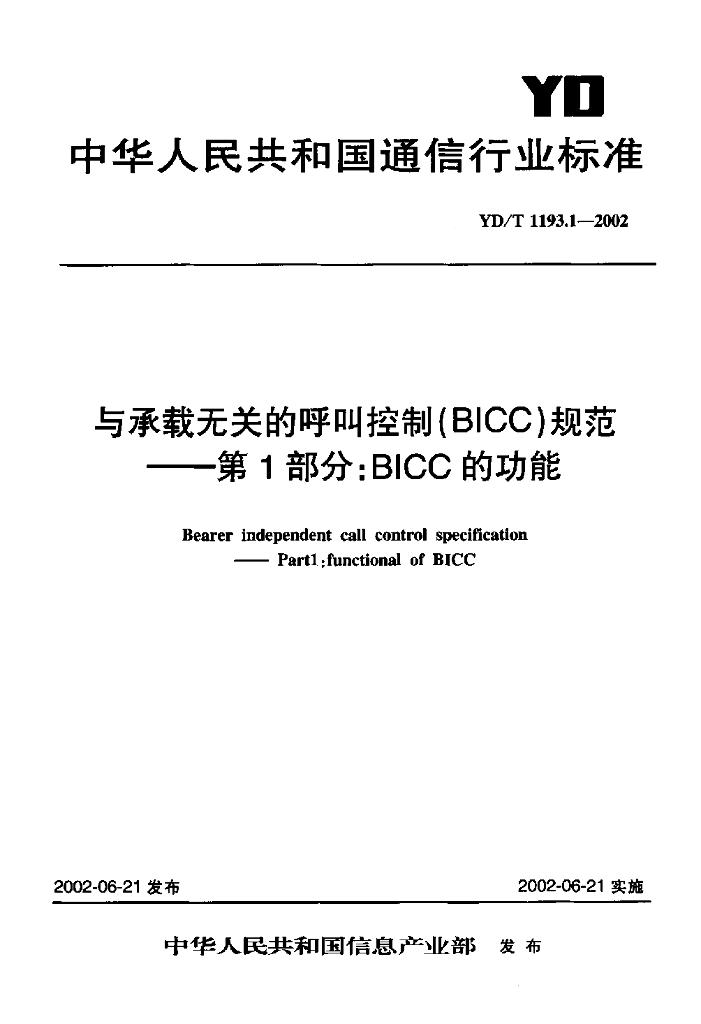 YD/T 1193.1-2002 与承载无关的呼叫控制(BICC)规范——第1部分:BICC 的功能