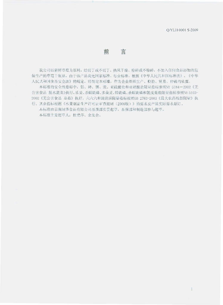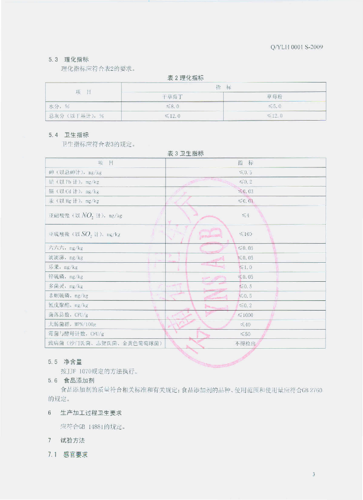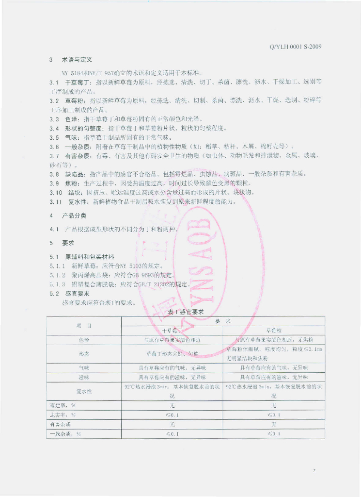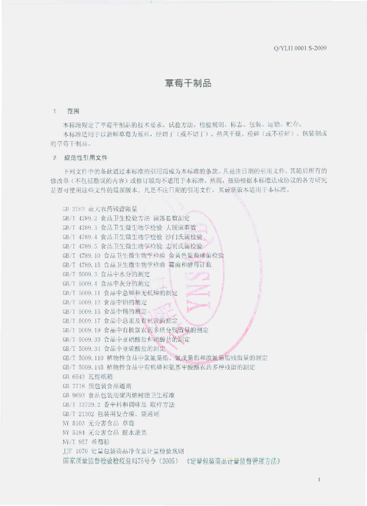 Q/YLH 0001S-2009 草莓干制品