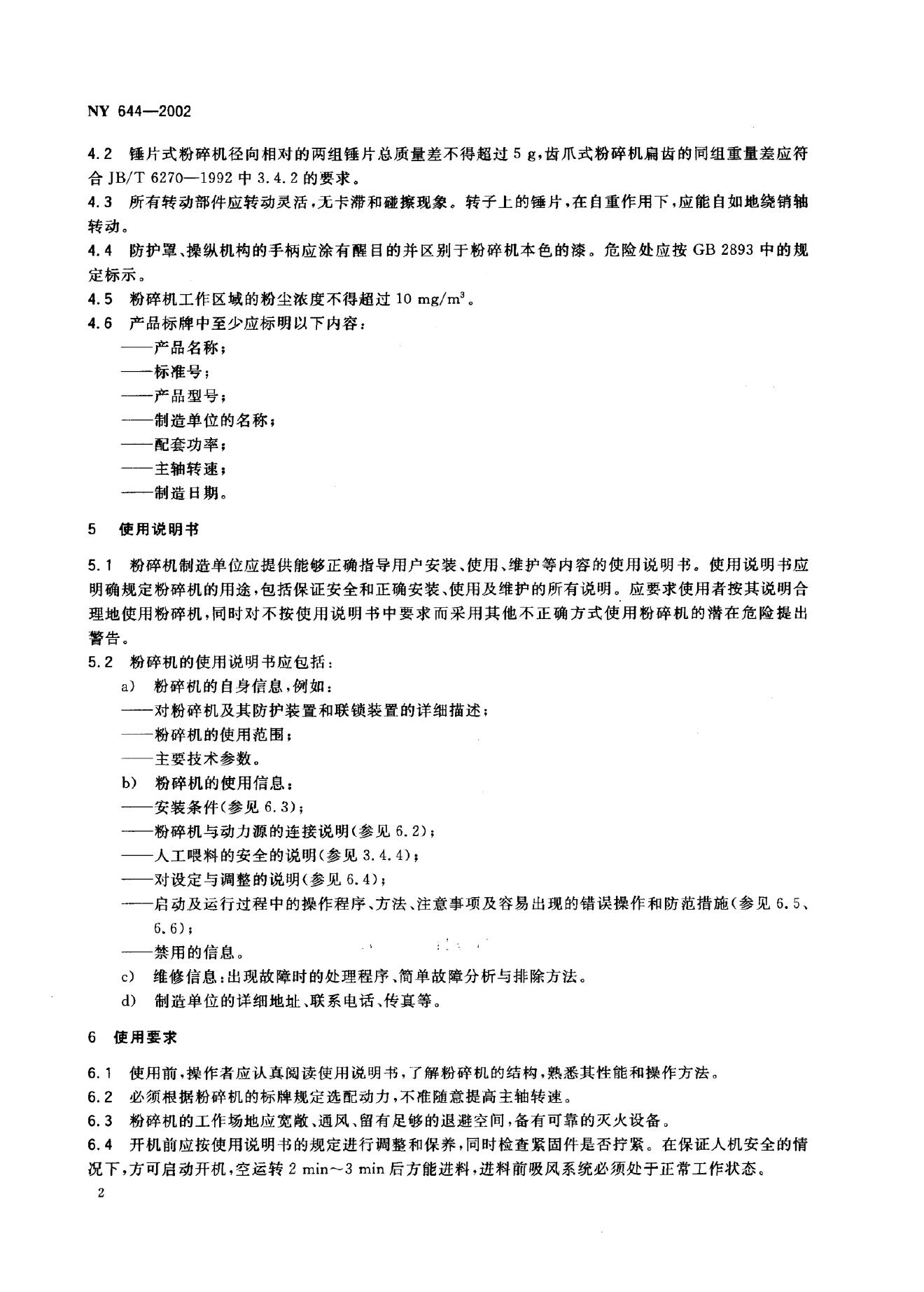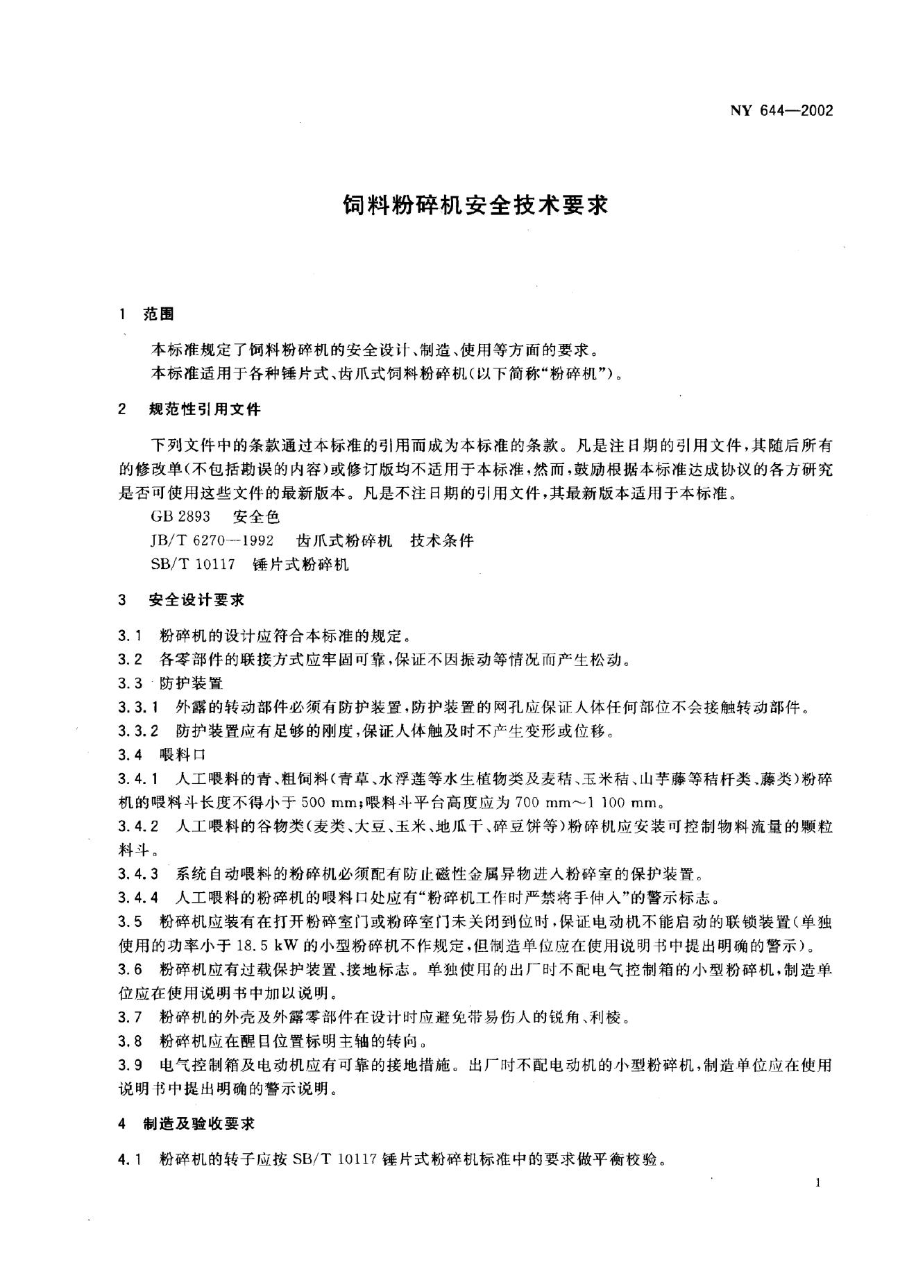 NY 644-2002 饲料粉碎机安全技术要求