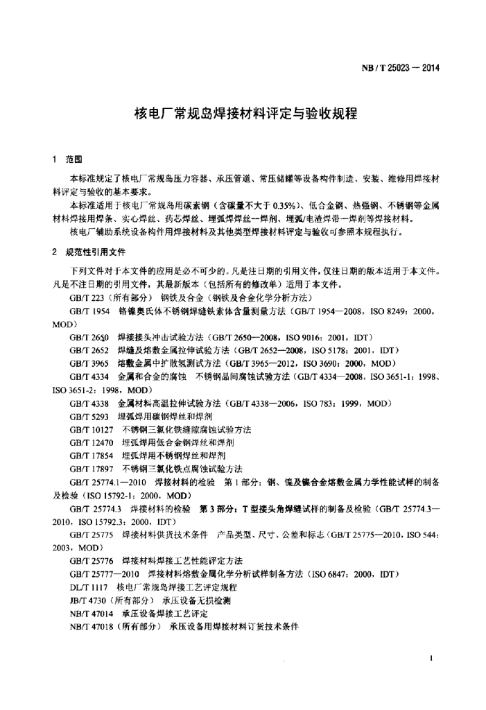 NB/T 25023-2014 核电厂常规岛焊接材料评定与验收规程