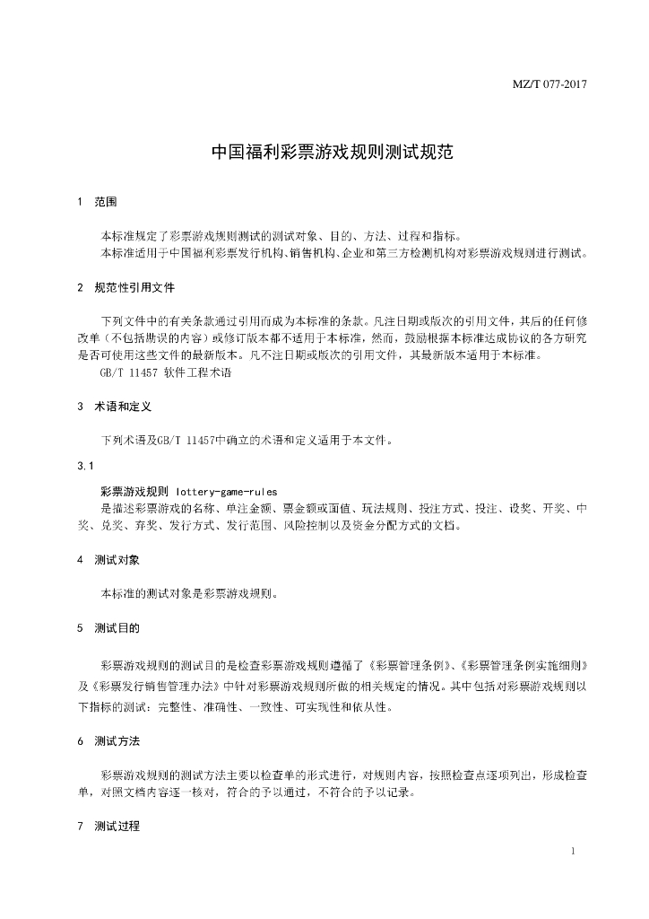 MZ/T 077-2017 中国福利彩票游戏规则测试规范