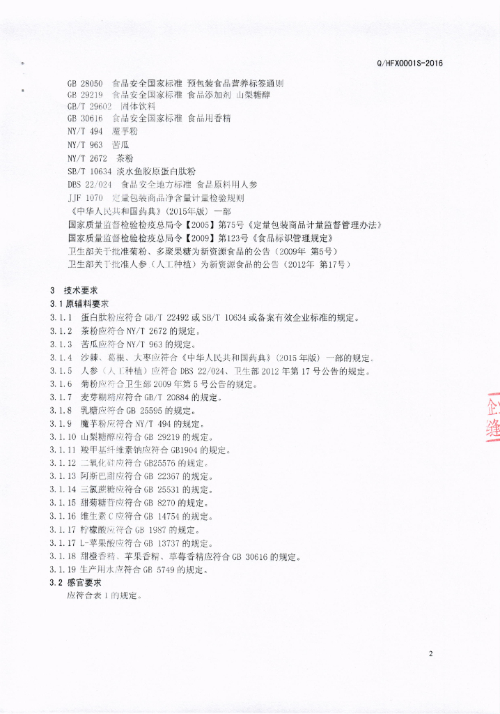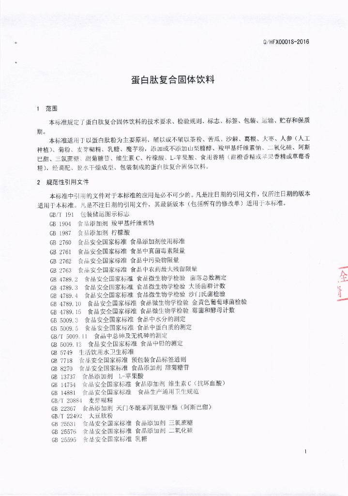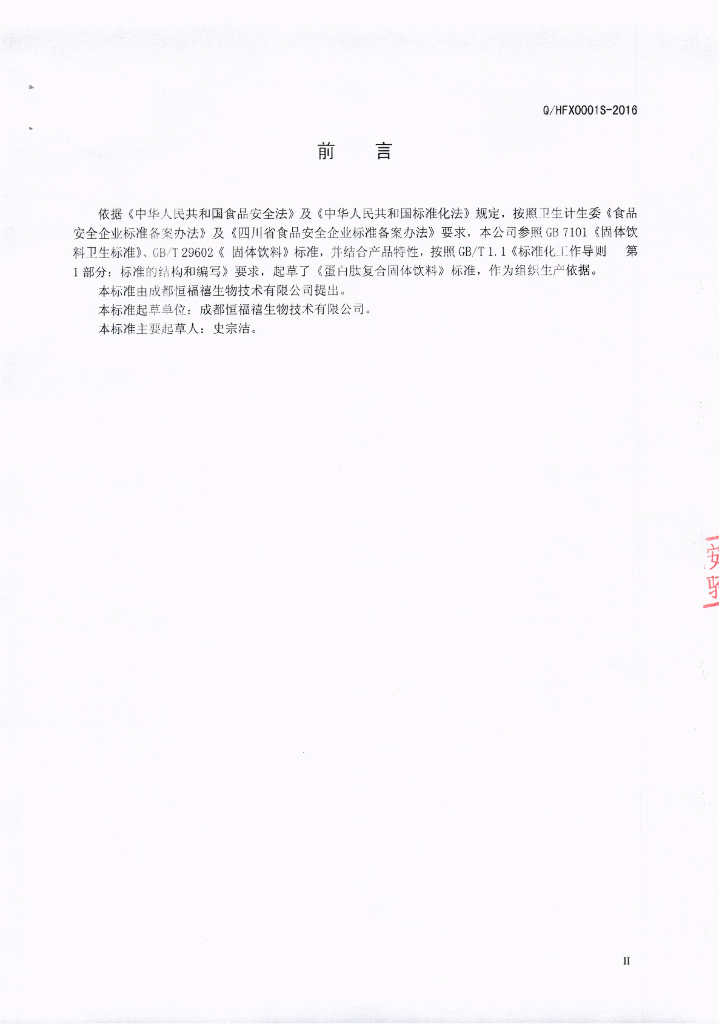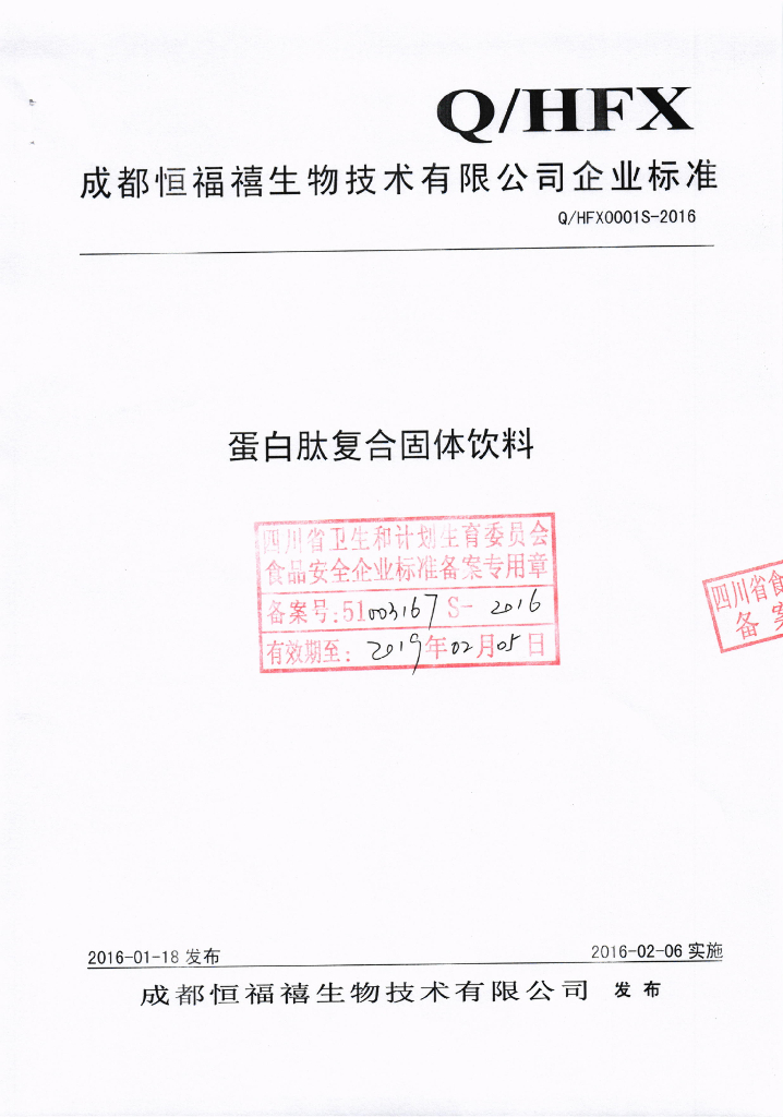 Q/HFX 0001S-2016 成都恒福禧生物技术有限公司 蛋白肽复合固体饮料