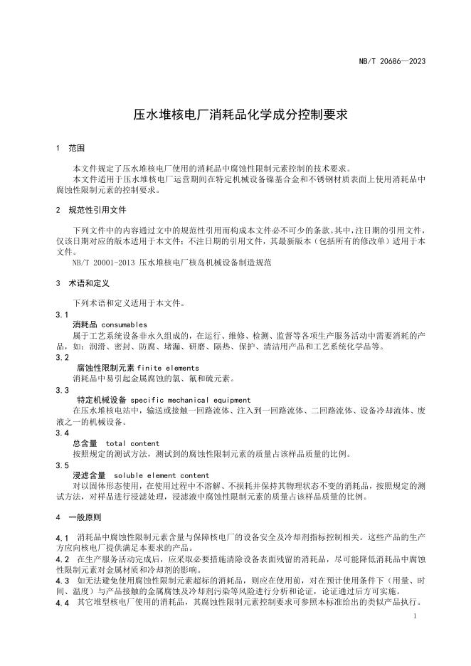 NB/T 20686-2023 压水堆核电厂消耗品化学成分控制技术要求