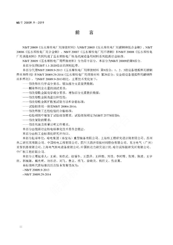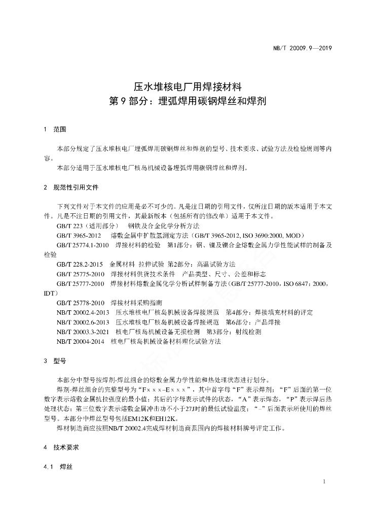NB/T 20009.9-2021 压水堆核电厂用焊接材料 第9部分:埋弧焊用碳钢焊丝和焊剂