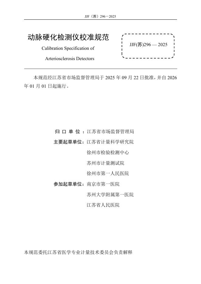JJF(苏)296-2025 动脉硬化检测仪校准规范