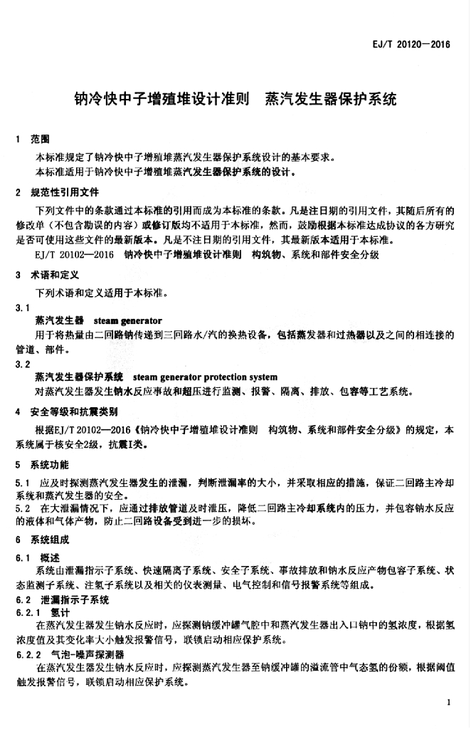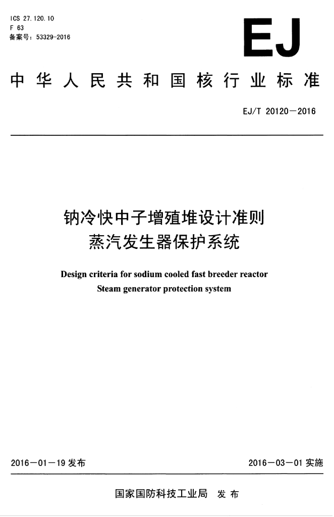 EJ/T 20120-2016 钠冷快中子增殖堆设计准则 蒸汽发生器保护系统
