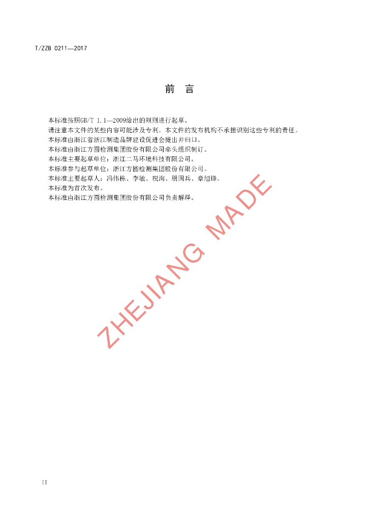 本标准由浙江方圆检测集团股份有限公司牵头组织制订。、本标准主要起草单位:浙江二马环境科技有限公司。、本标准参与起草单位:浙江方圆检测集团股份有限公司。