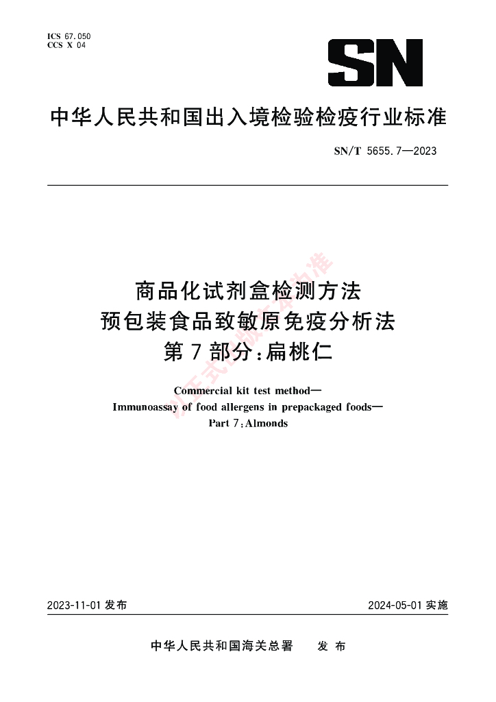 SN/T 5655.7-2023 商品化试剂盒检测方法 预包装食品致敏原免疫分析法 第7部分:扁桃仁