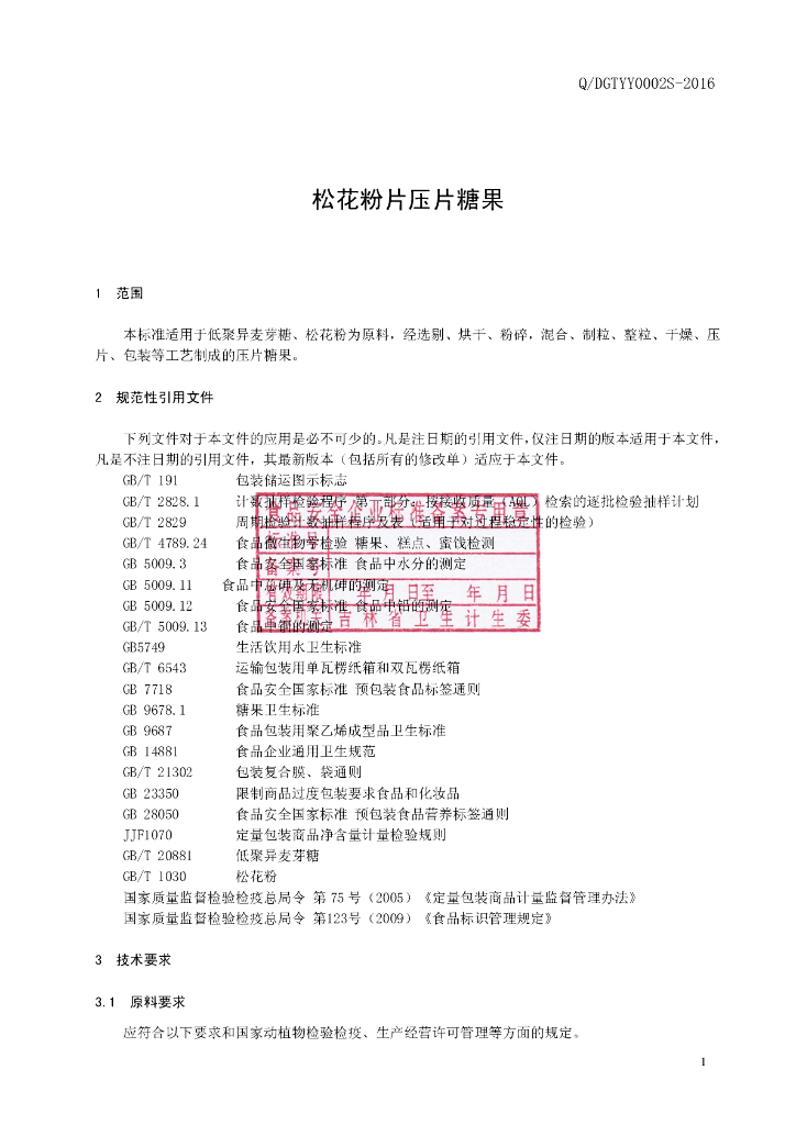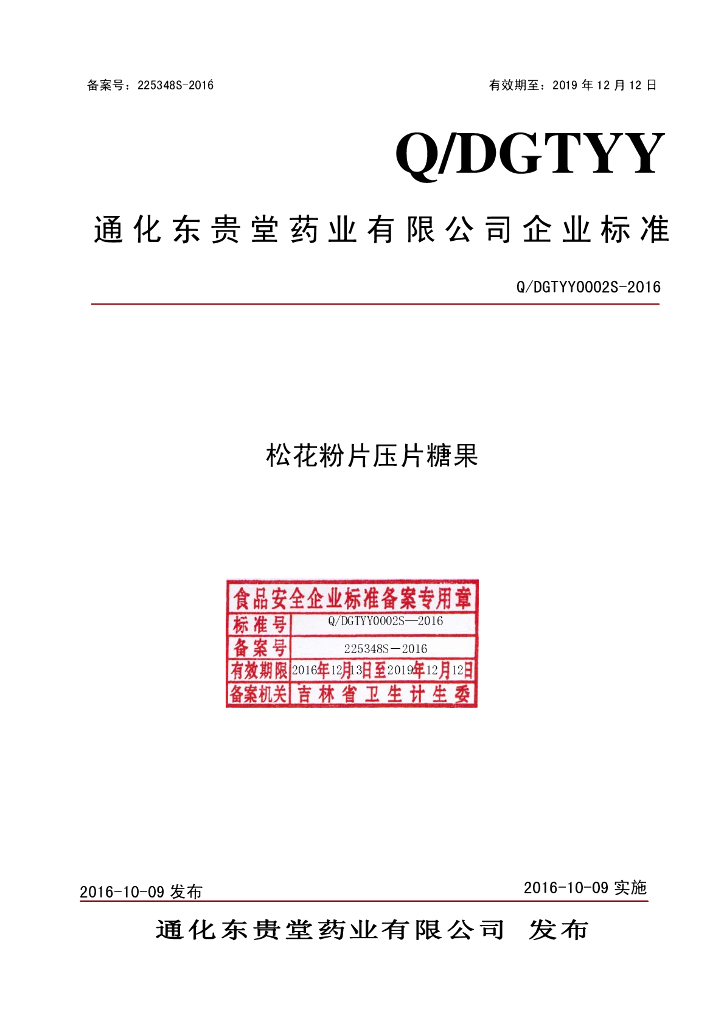 Q/DGTYY 0002S-2016 通化东贵堂药业有限公司 松花粉片压片糖果