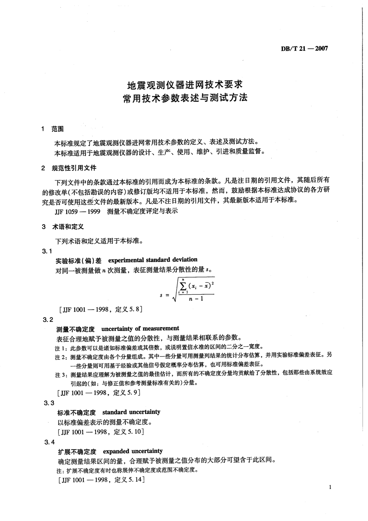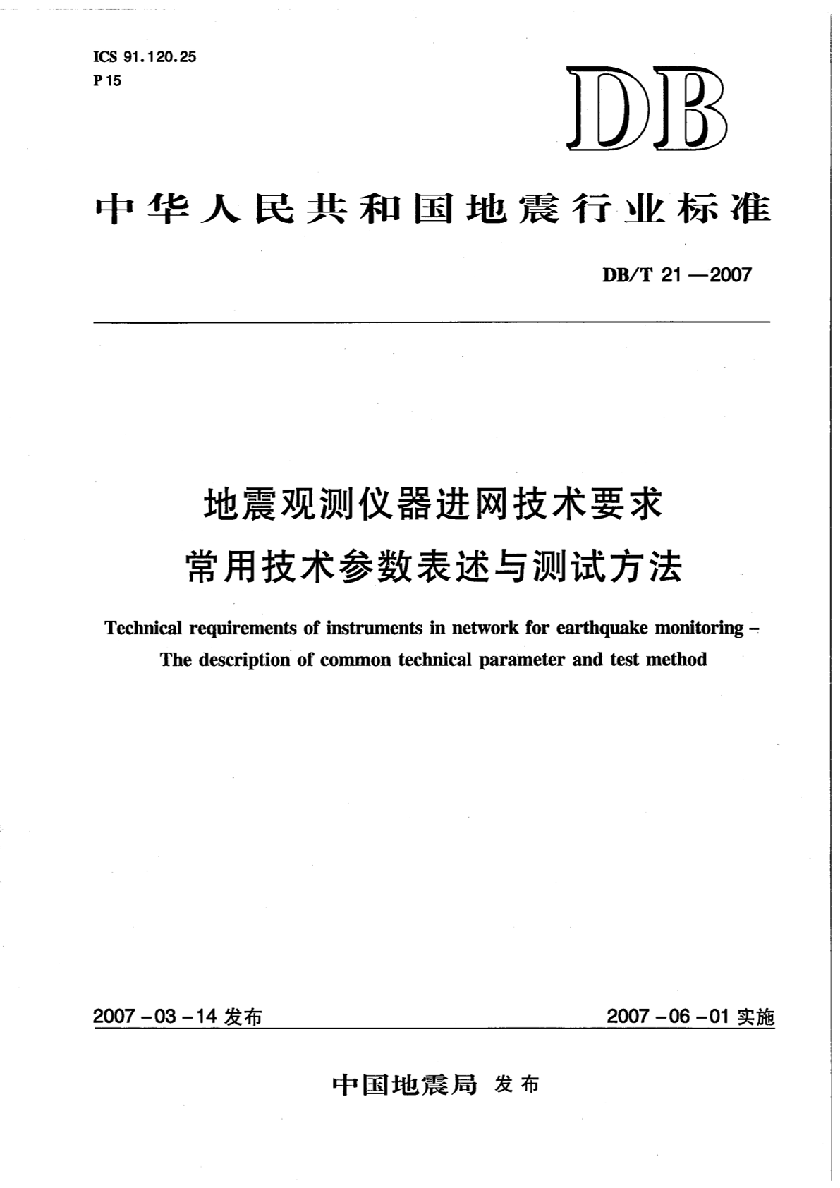 DB/T 21-2007 地震观测仪器进网技术要求 常用技术参数表述与测试方法