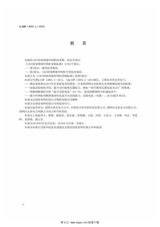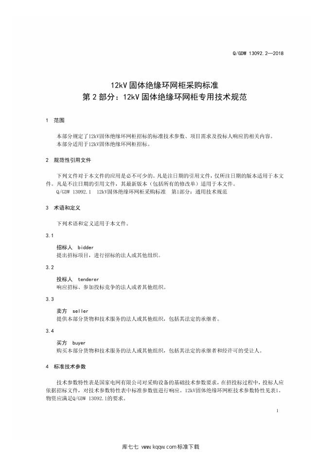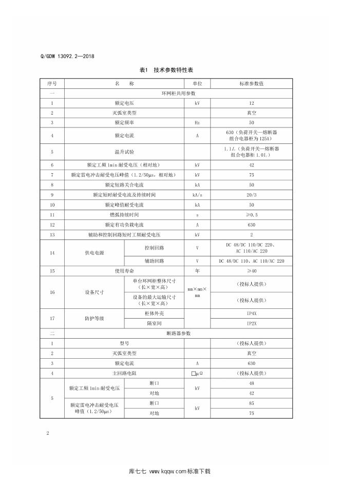 Q/GDW 13092.2-2018 12kV固体绝缘环网柜采购标准 第2部分:12kV固体绝缘环网柜专用技术规范