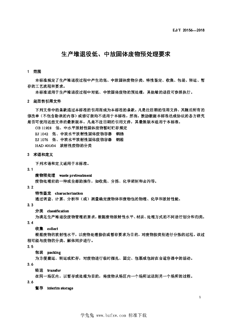EJ/T 20156-2018 生产堆退役低、中放固体废物预处理要求