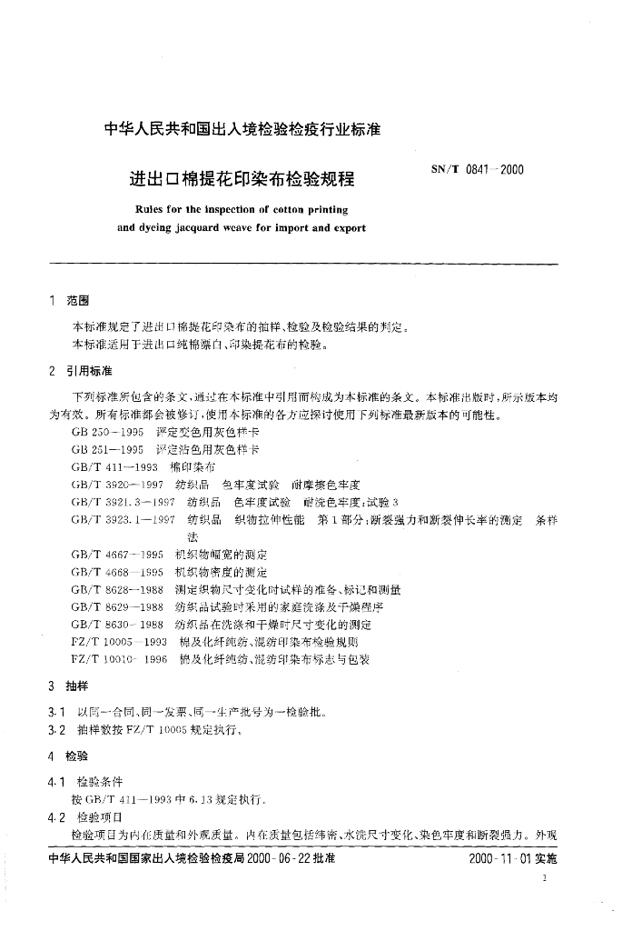 SN/T 0841-2000 进出口棉提花印染布检验规程