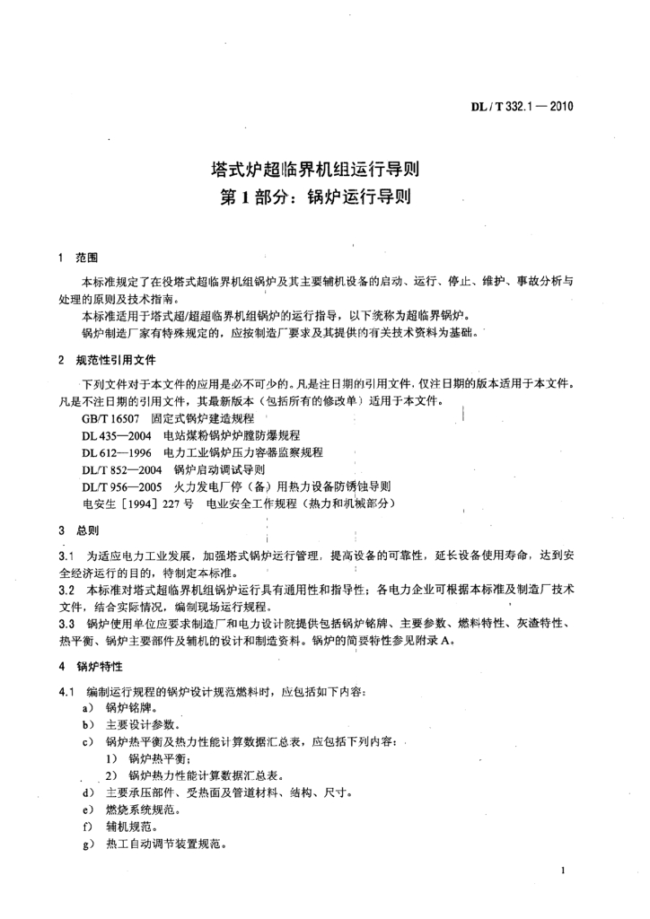 DL/T 332.1-2010 塔式炉超临界机组运行导则 第1部分:锅炉运行导则