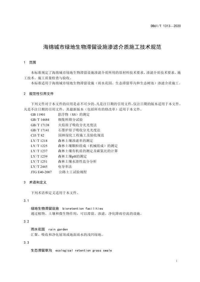 DB61/T 1313-2020 海绵城市绿地生物滞留设施渗滤介质施工技术规范