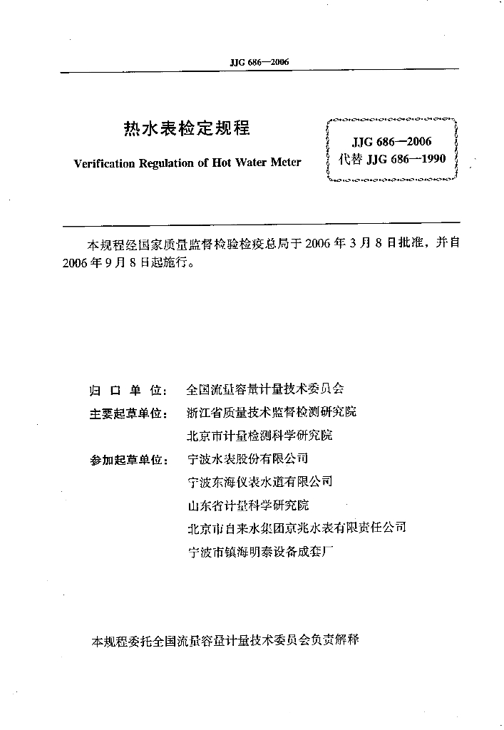 浙江省质量技术监督检测研究院、北京市计量检测科学研究院、宁波水表股份有限公司、宁波东海仪表水道有限公司、山东省计量科学研究院、北京市自来水集团京兆水表有限责任公司、宁波市镇海明泰设备成套厂