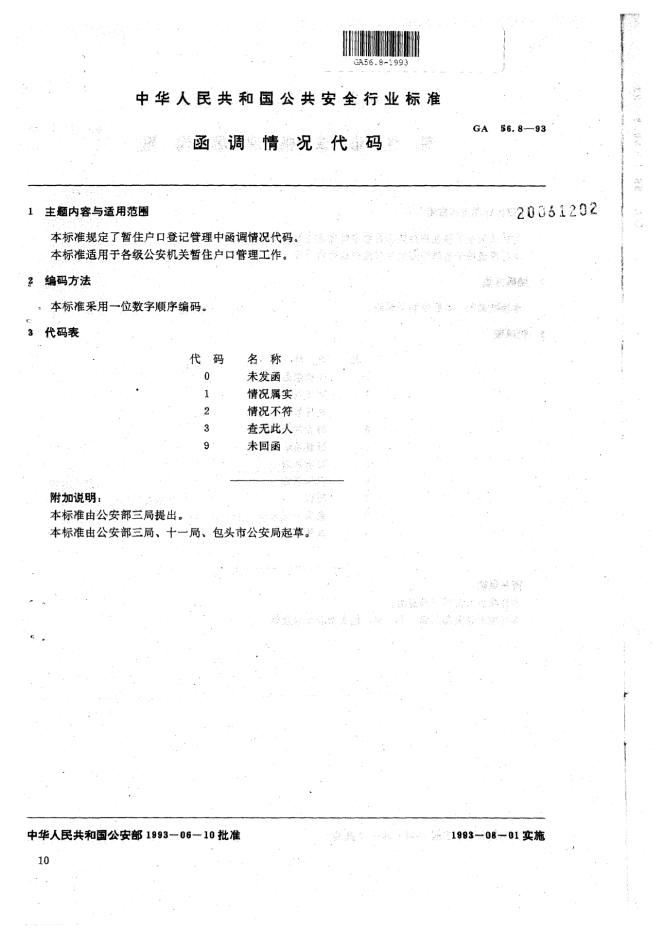 GA 56.8-1993 暂住人口基本信息管理标准 函调情况代码
