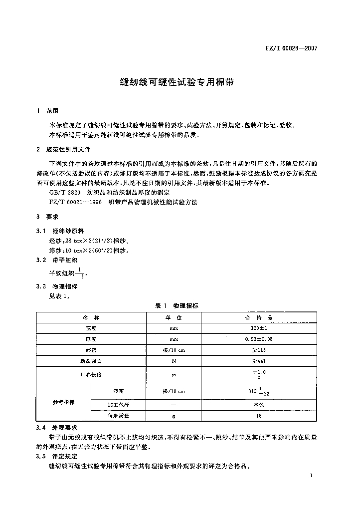 FZ/T 60028-2007 缝纫线可缝性试验专用棉带