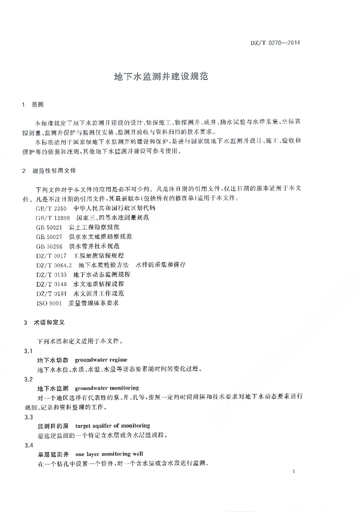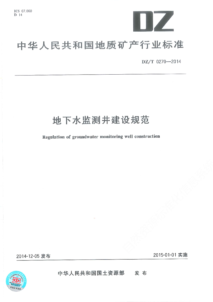 DZ/T 0270-2014 地下水监测井建设规范