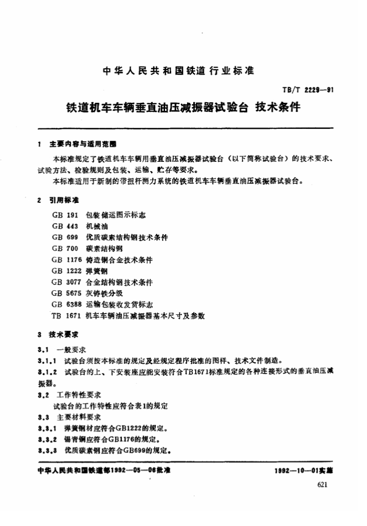 TB/T 2229-1991 铁道机车车辆垂直油压减振器试验台技术条件
