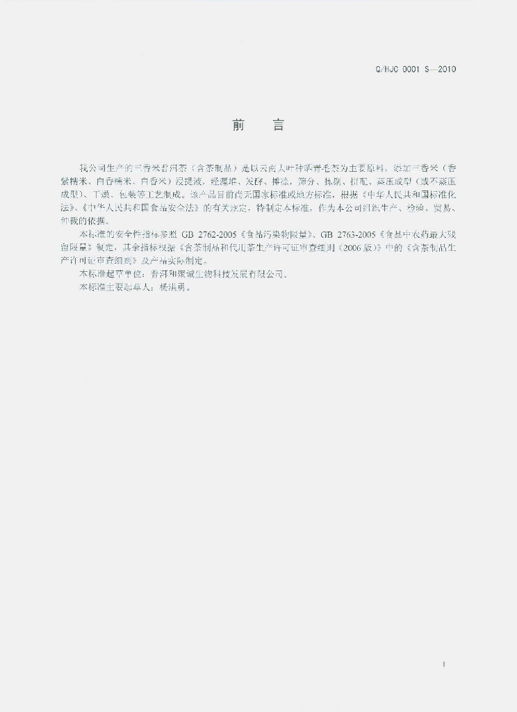 Q/HJC 0001S-2010 三香米普洱茶(含茶制品)