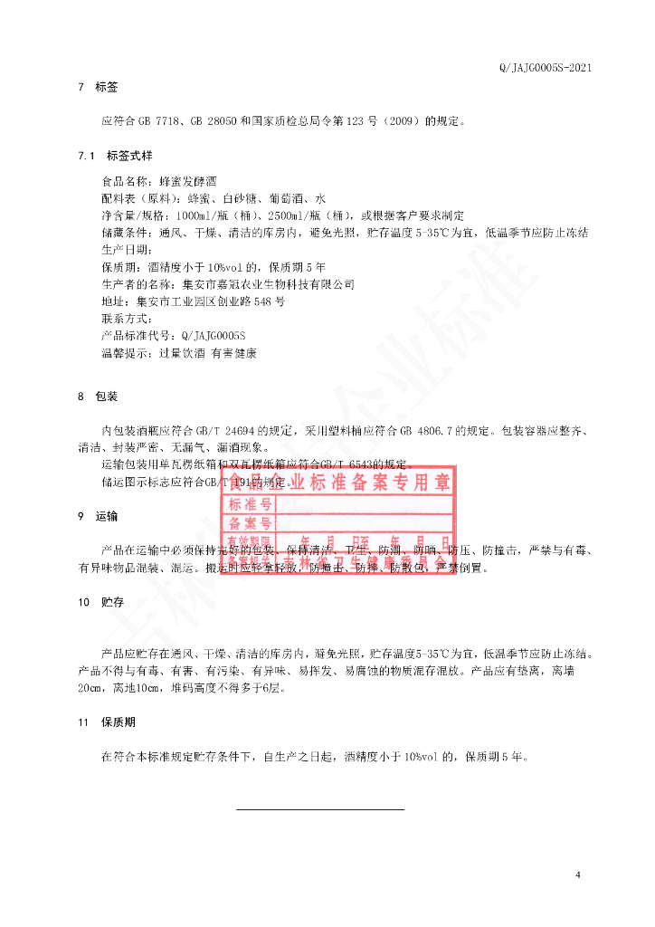 Q/JAJG 0005S-2021 蜂蜜发酵酒