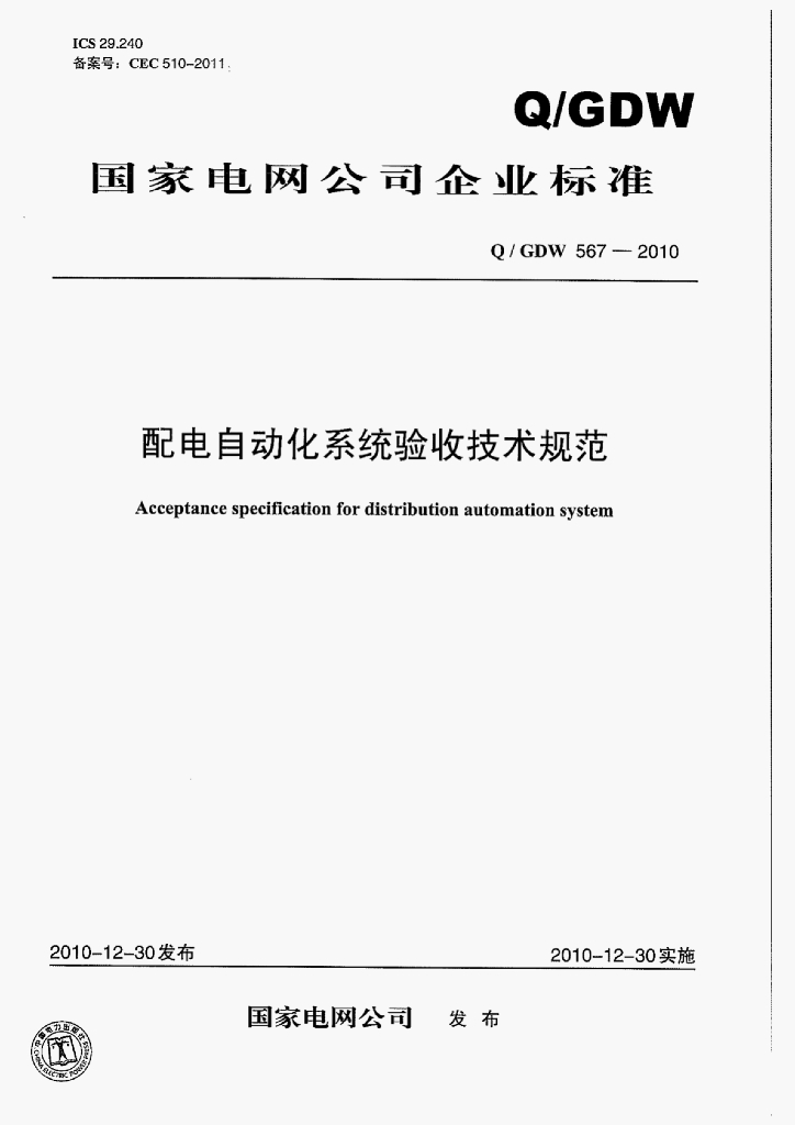 Q/GDW 567-2010 配电自动化系统验收技术规范