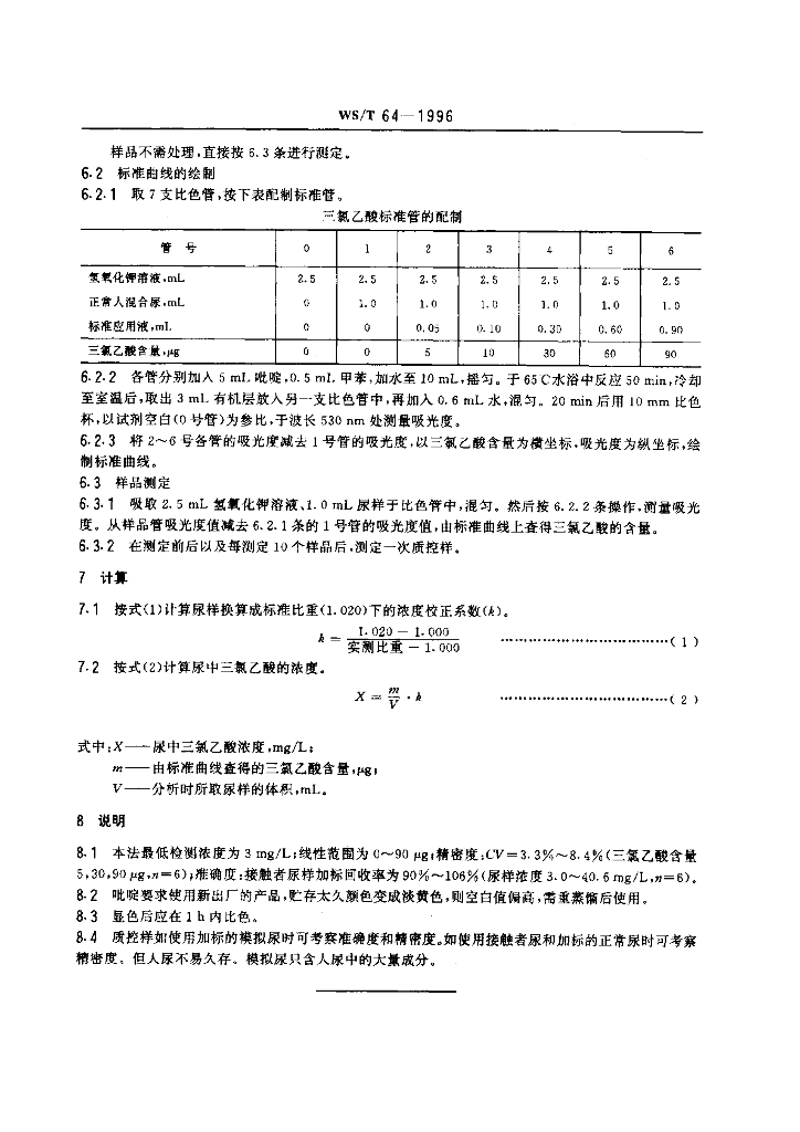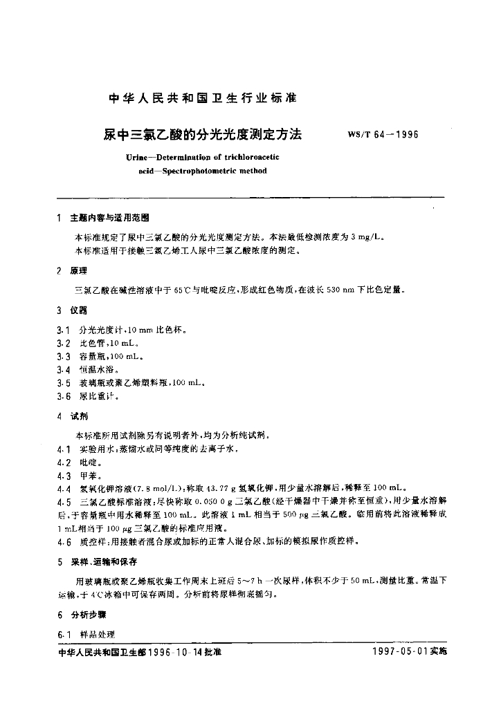 WS/T 64-1996 尿中三氯乙酸的分光光度测定方法