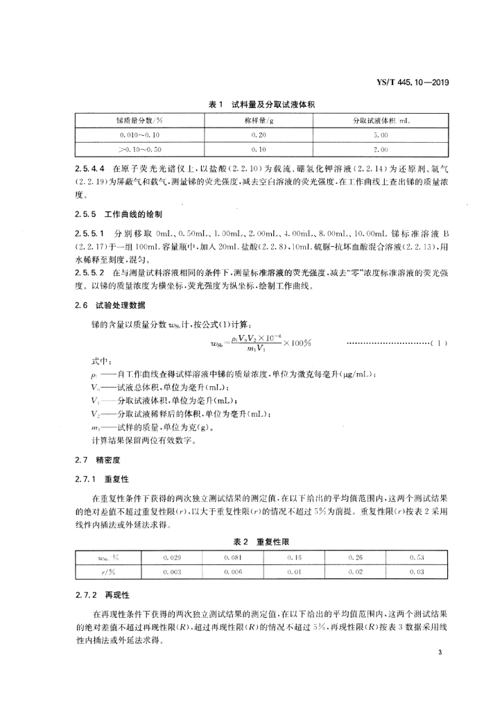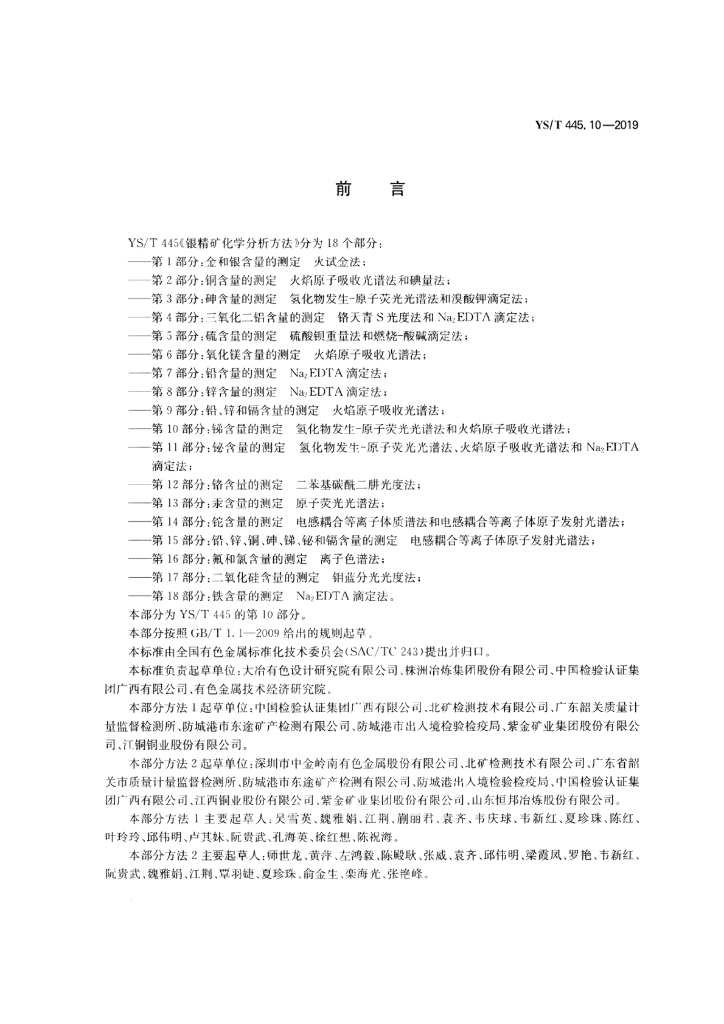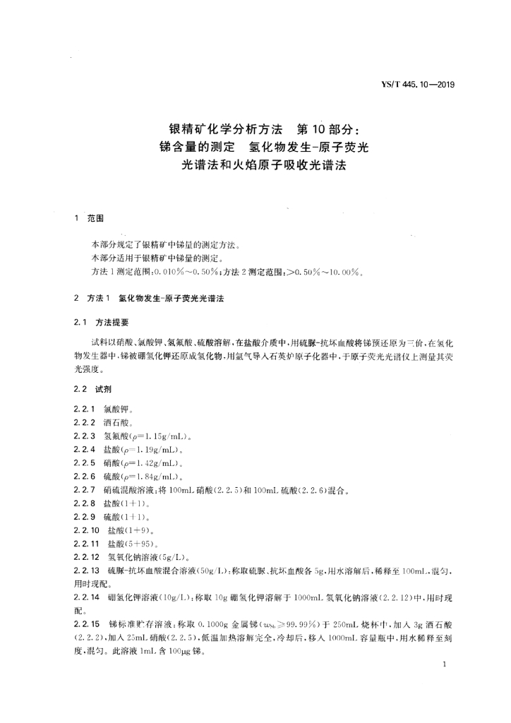 YS/T 445.10-2019 银精矿化学分析方法 第10部分:锑含量的测定 氢化物发生-原子荧光光谱法和火焰原子发射光谱法