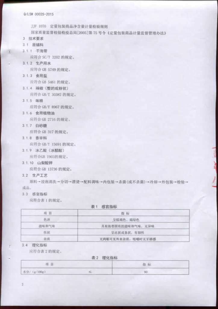 Q/LSW 0002S-2015 临沂市河东区盛旺调料厂 调味海带丝