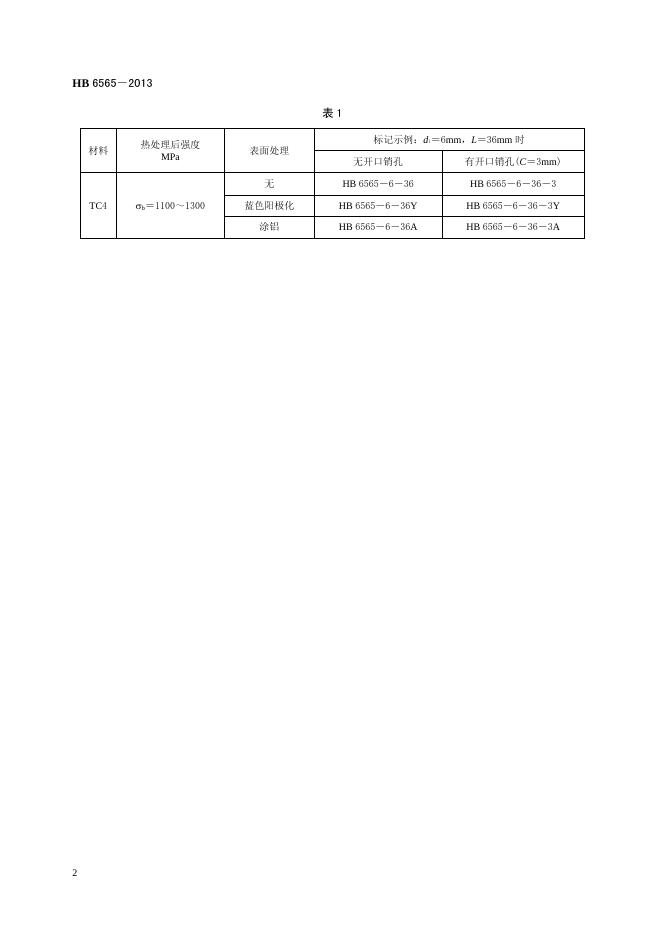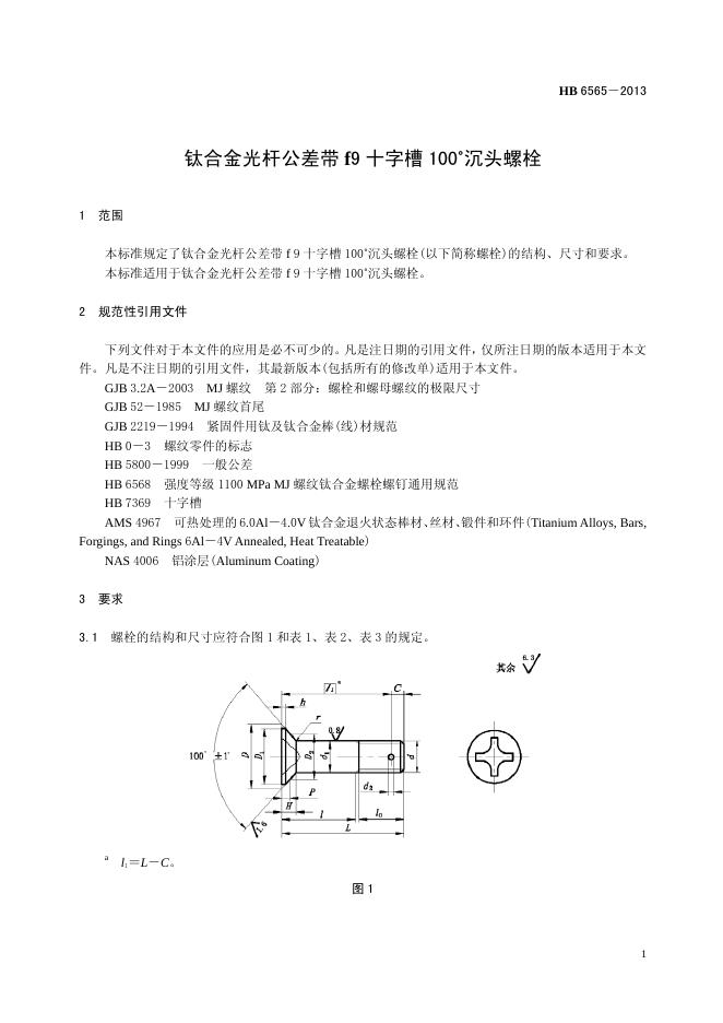 HB 6565-2013 钛合金光杆公差带F9十字槽100°沉头螺栓(2017)