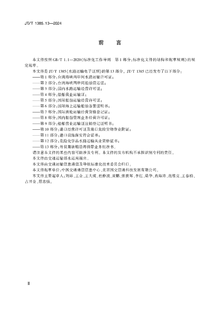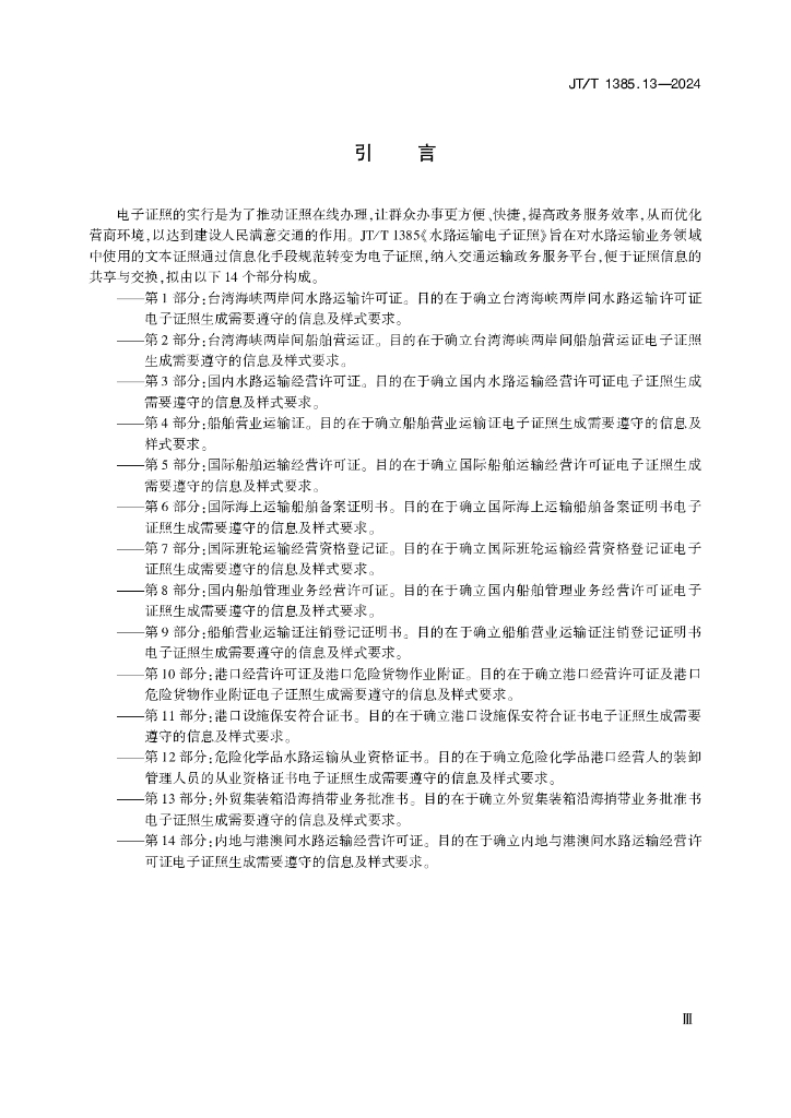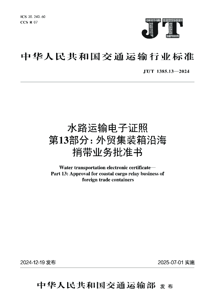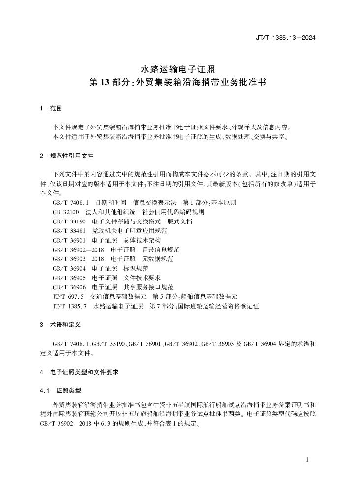 JT/T 1385.13-2024 水路运输电子证照 第13部分:外贸集装箱沿海捎带业务批准书