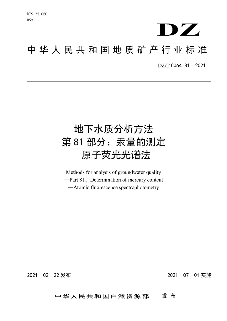 DZ/T 0064.81-2021 地下水质分析方法 第81部分:汞量的测定原子荧光光谱法