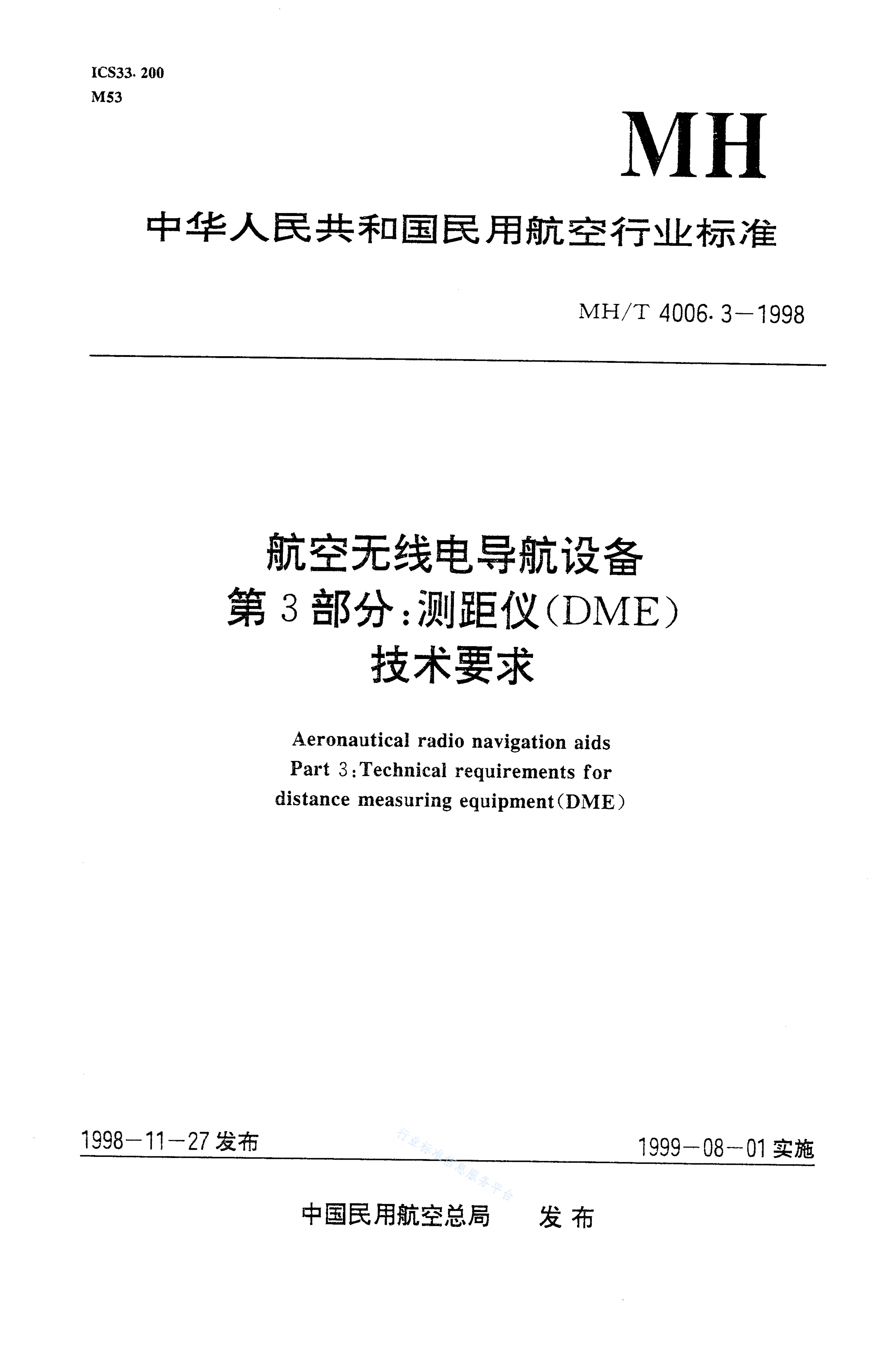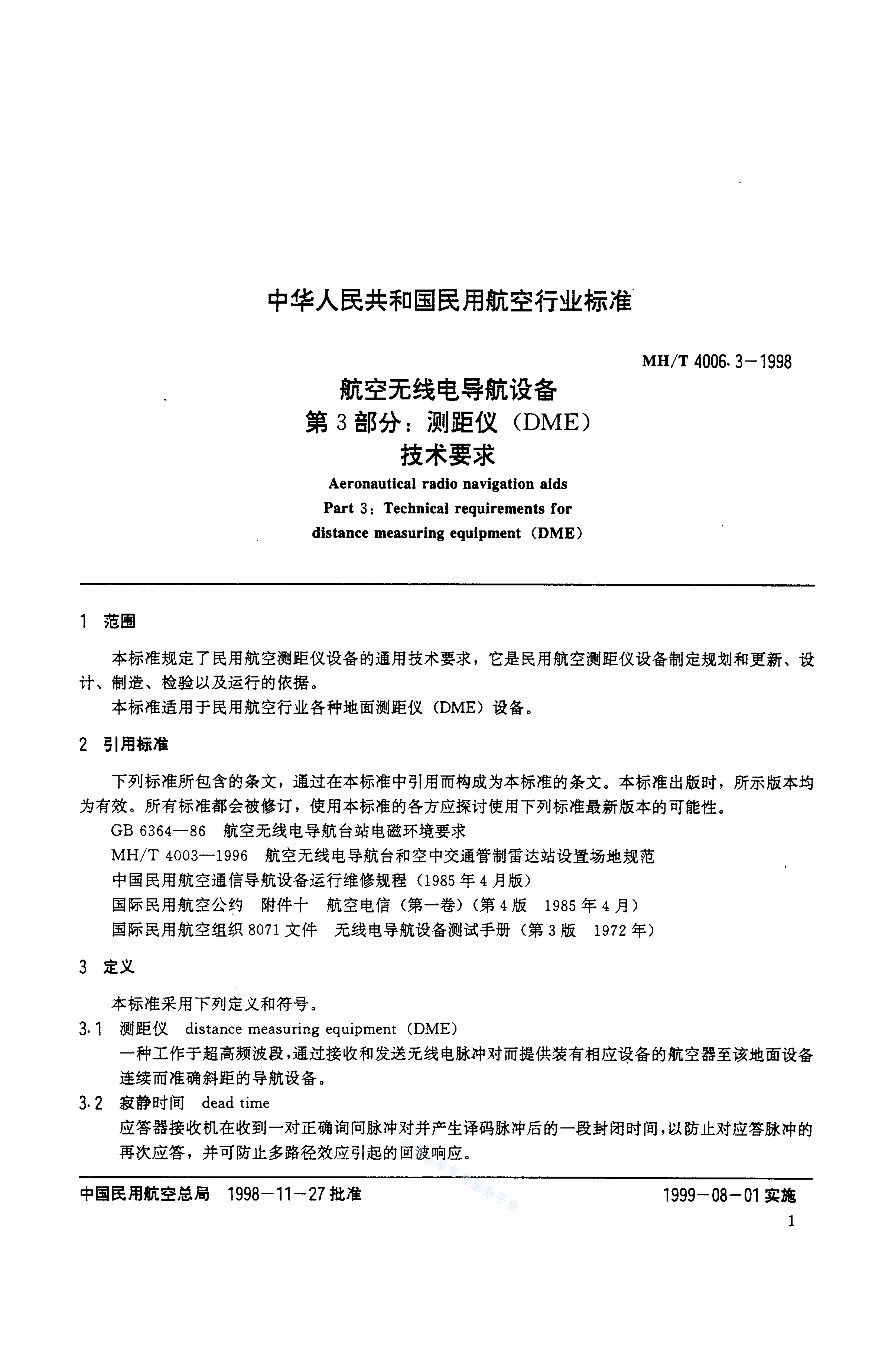 MH/T 4006.3-1998 航空无线电导航设备 第3部分:测距仪(DME)技术要求