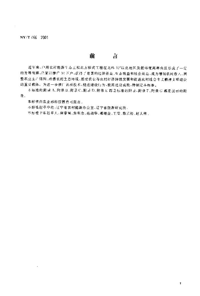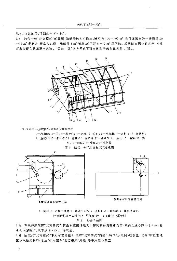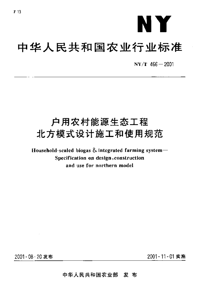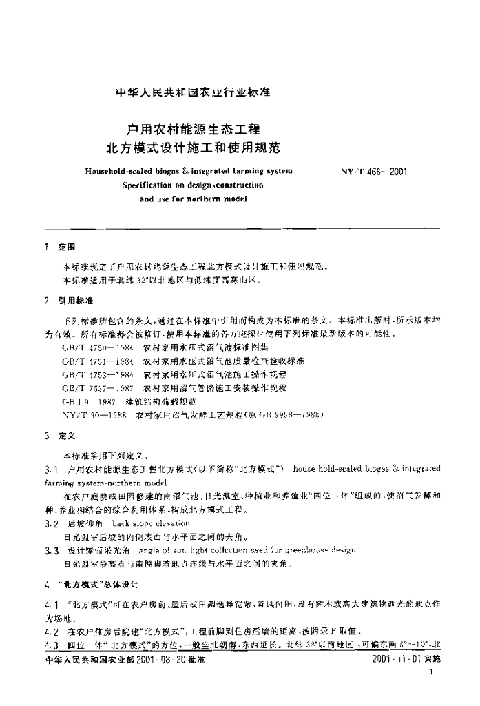 NY/T 466-2001 户用农村能源生态工程北方模式设计施工和使用规范