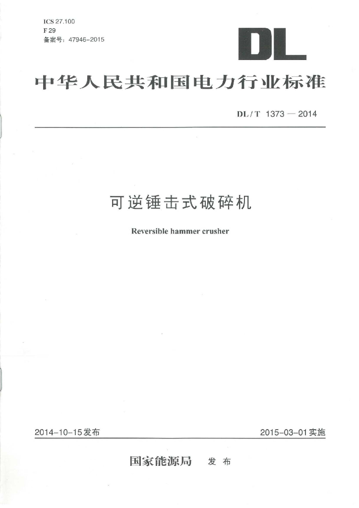 DL/T 1373-2014 可逆锤击式破碎机