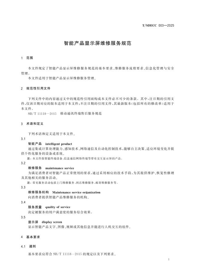 T/SDECC 003-2025 智能产品显示屏维修服务规范