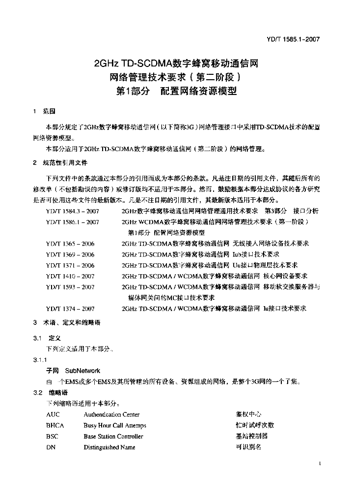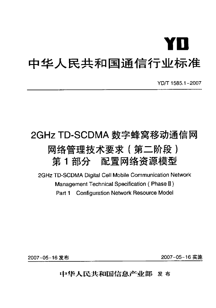 YD/T 1585.1-2007 2GHz TD-SCDMA 数字蜂窝移动通信网网络管理技术要求(第二阶段) 第1部分:配置网络资源模型