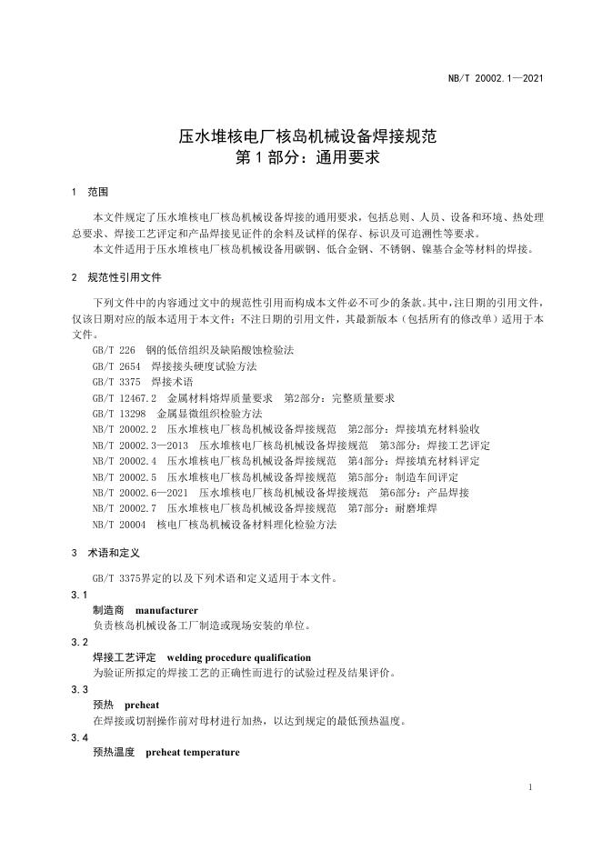 NB/T 20002.1-2021 压水堆核电厂核岛机械设备焊接规范 第1部分:通用要求