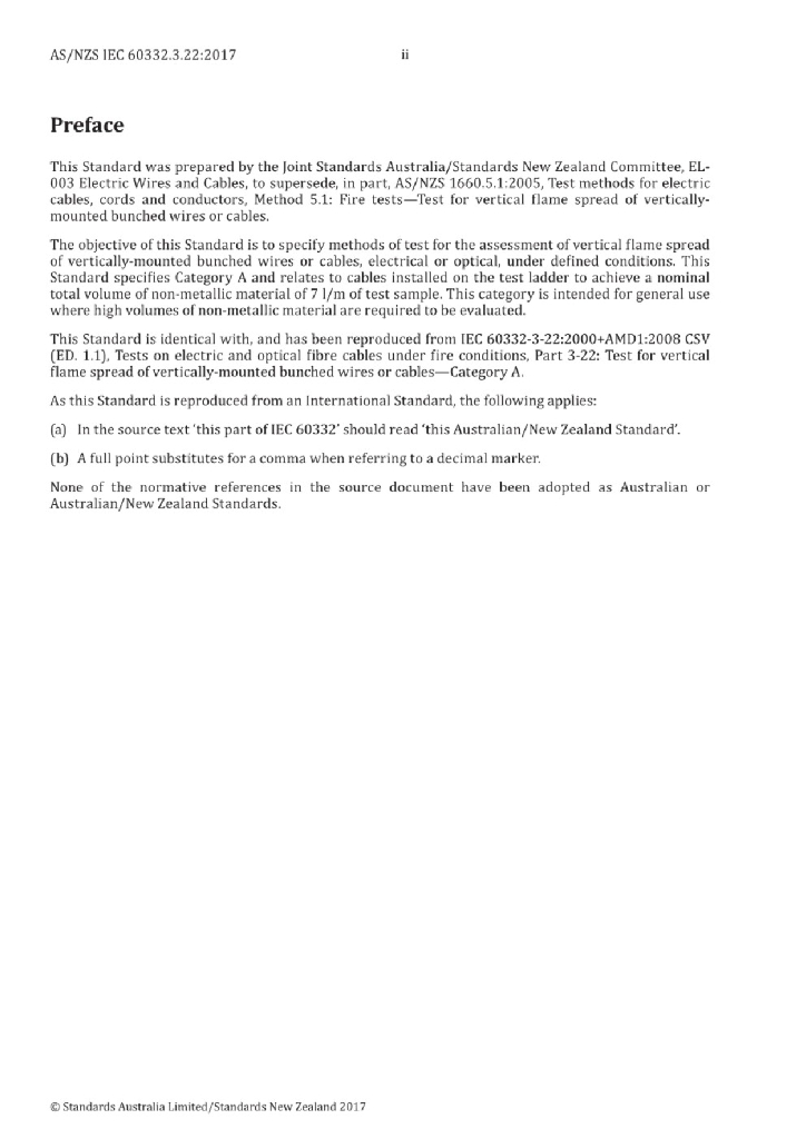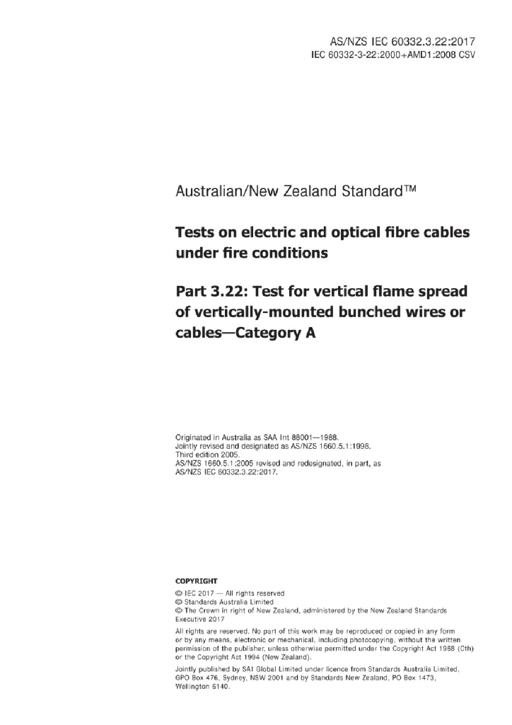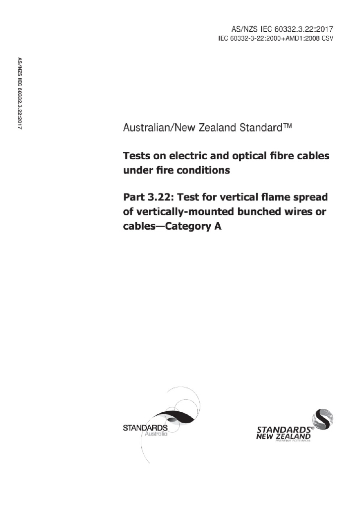AS/NZS IEC 60332.3.22:2017 电缆和光缆在火焰条件下的燃烧试验 第3-22部分:垂直安装的成束电线电缆火焰垂直蔓延试验 A类