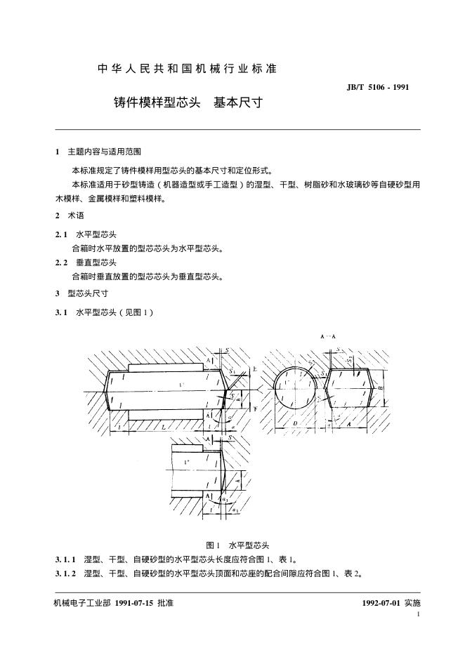 JB/T 5106-1991 铸件模样型芯头 基本尺寸