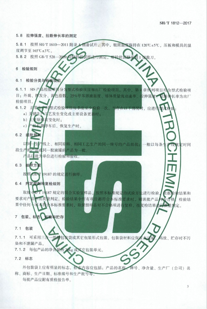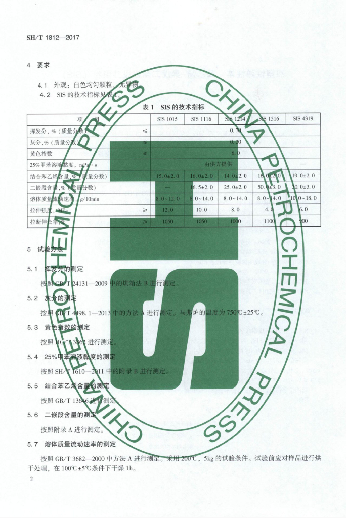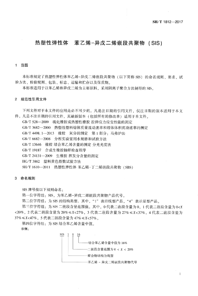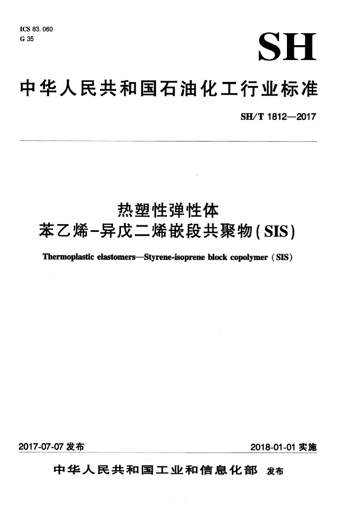 SH/T 1812-2017 热塑性弹性体 苯乙烯-异戊二烯嵌段共聚物(SIS)
