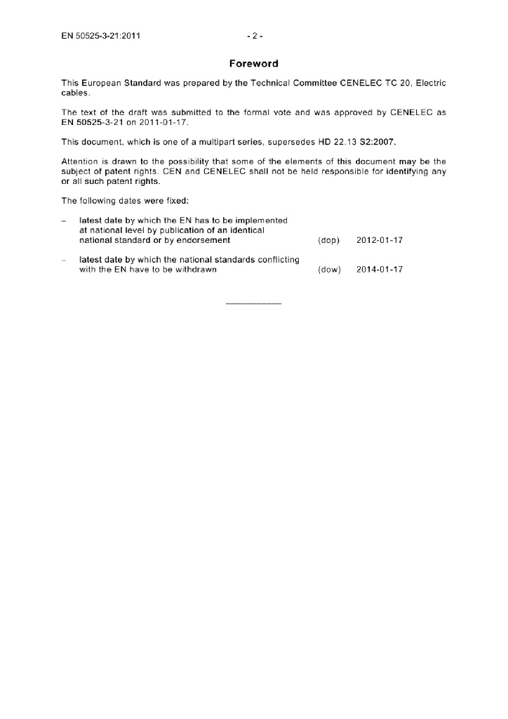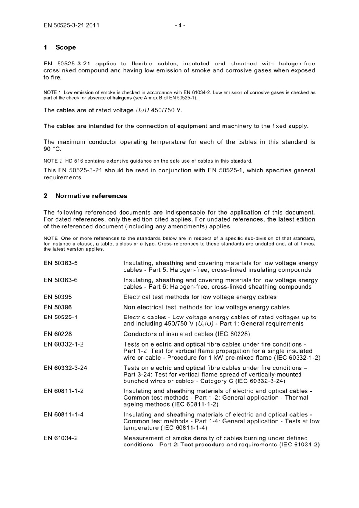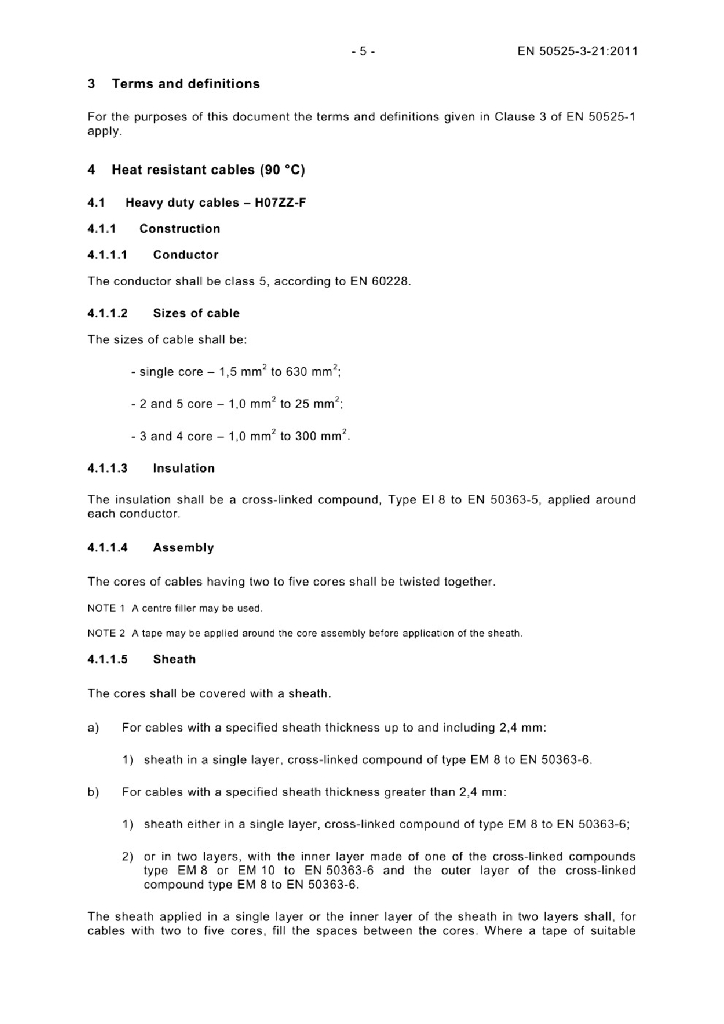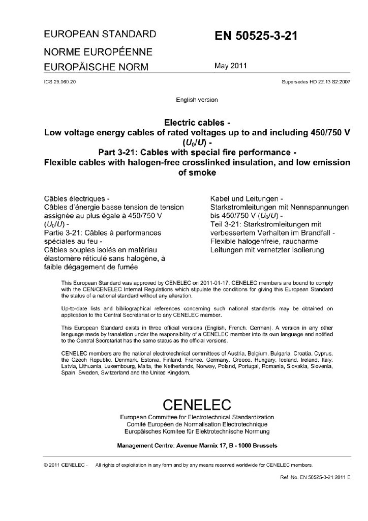 EN 50525-3-21:2011 额定电压450/750V及以下低压节能电缆 - 第3-21部分 具有特殊防火性能的电缆 - 低烟无卤交联绝缘软电缆