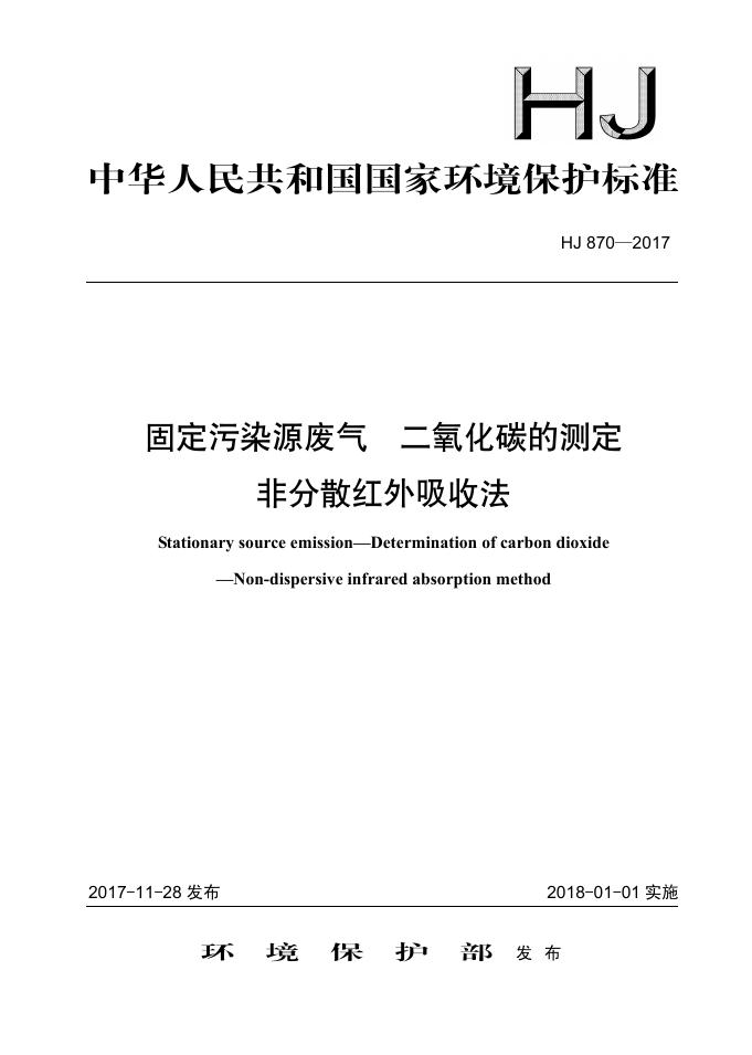 HJ 870-2017 固定污染源废气 二氧化碳的测定 非分散红外吸收法