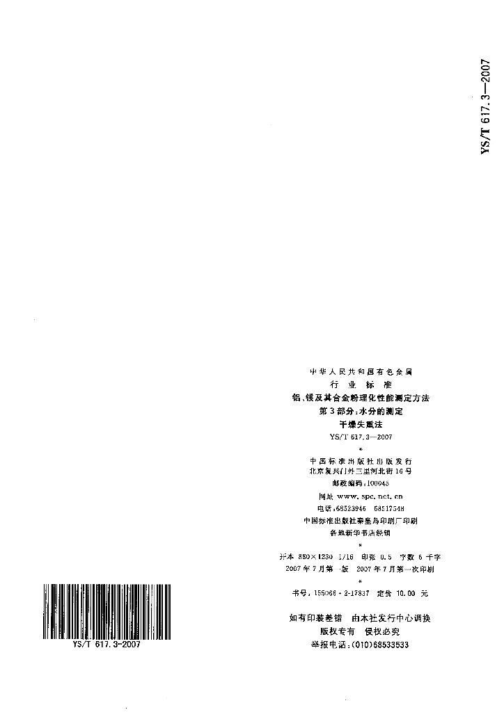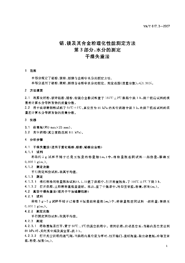 YS/T 617.3-2007 铝、镁及其合金粉理化性能测定方法 第3部分:水分的测定 干燥失重法